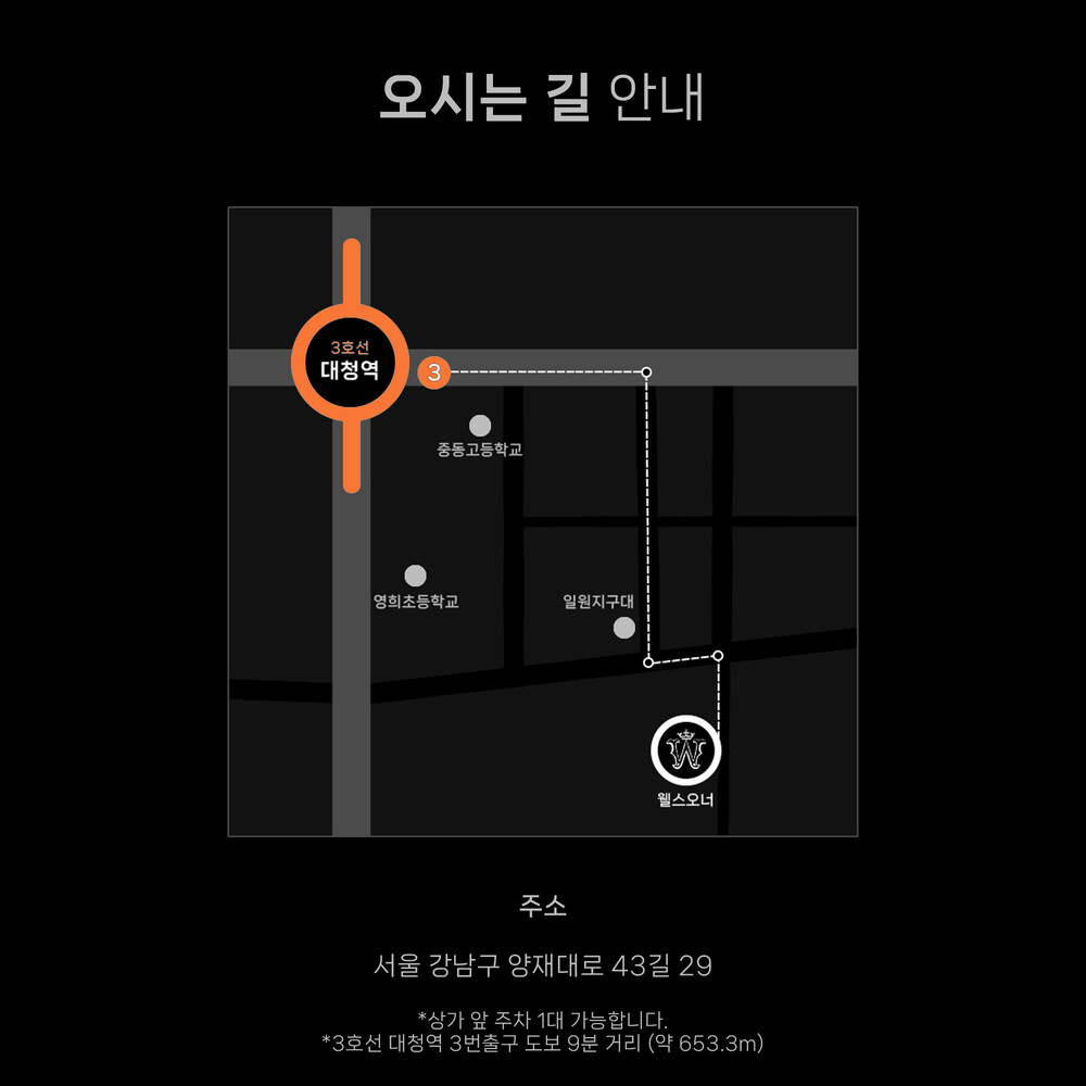 - 위치: 서울 강남구 양재대로 43길 29 1층 웰스오너 *상가 앞 주차 1대 가능합니다.